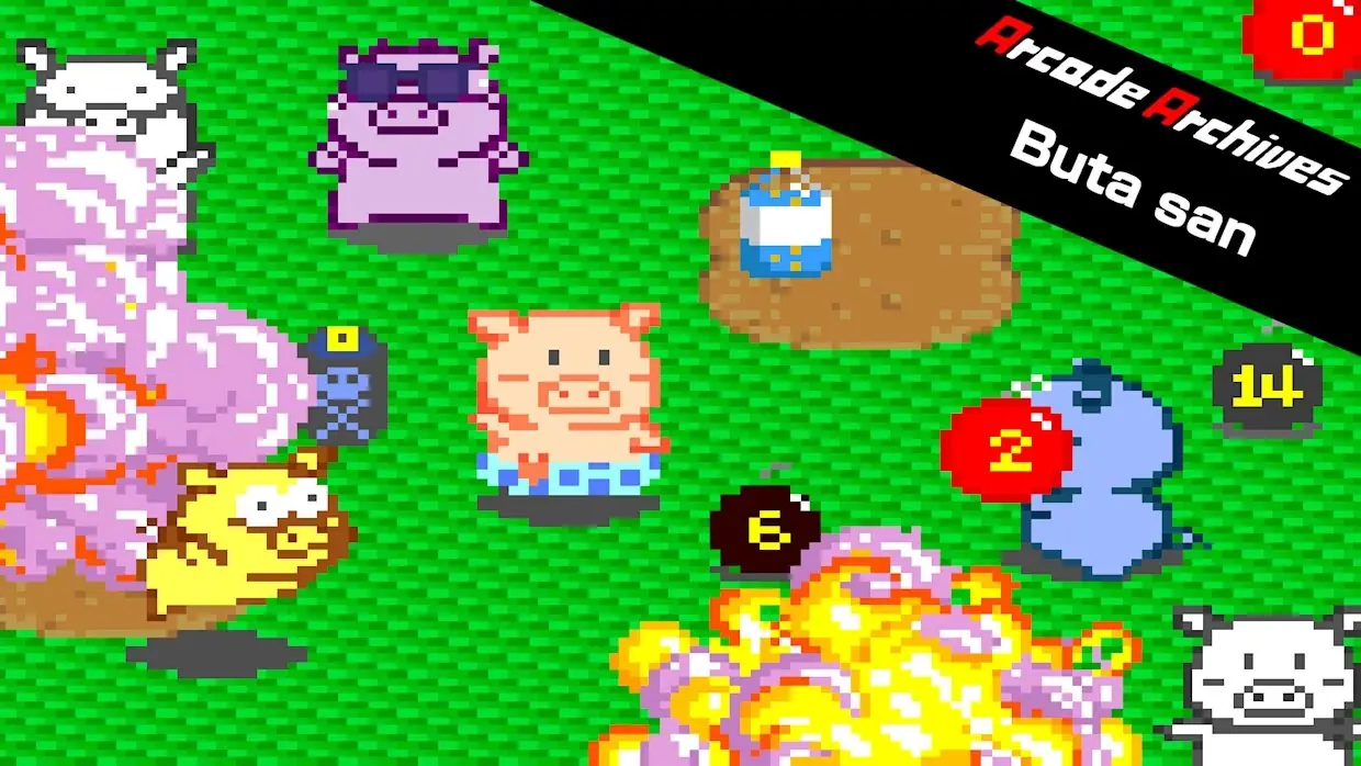 《Arcade Archives Buta san》是HAMSTER复刻NMK开发、JALECO 1987年发行的经典俯视视角炸弹对战街机作品,核心是猪角色互扔时限炸弹的生存竞技玩法,适合怀旧玩家与多人休闲对战。以下是详细介绍: